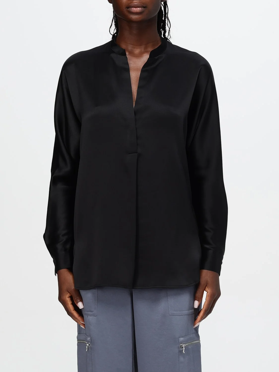 DESCRIPTION - Neckline: V neckline - Shoulders: Regular - Sleeves: Long - Bottom: With straight hemline - Materials: Satin - Pattern: Plain-colored DETAILS AND CARE Composition not available SIZE AND FIT Sizes not available Size and fit Regular fit Designer code: VR84511926 001BLK Giglio Code: G00782 Designer: Vince Collection: Vince Woman Category: Clothing Vince