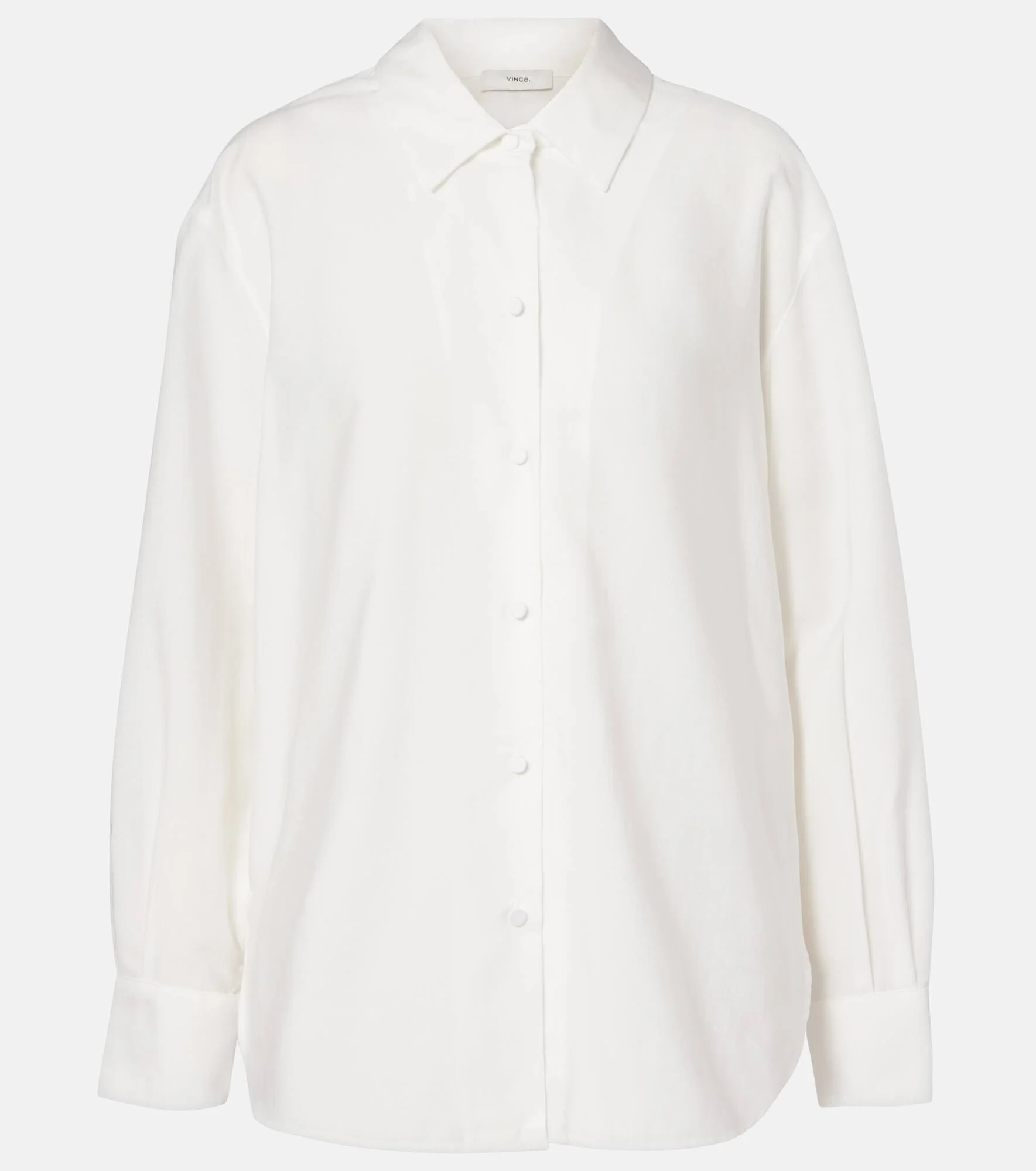 Look to Vince when building a timeless wardrobe of elevated yet understated styles. This classic shirt is crafted from crisp twill and features tuxedo-style details, such as the covered shank buttons and the polished finish. Product Details - Material: 89% lyocell, 11% nylon - Care instructions: hand wash cold - Made in Vietnam - Designer color name: Lt Cream - Item color: white - Collar: classic (Straight point) - Closure: buttoned front - Cuff: one button - Side slits - Hem: rounded - Item number: P01123973 Size & Fit - Fits large to size - we recommend trying one size smaller - Dropped shoulders - Oversized - Non-stretchy fabric - Falls below the hip - The model seen in the picture is 178cm-5'10" and wearing a size XXS