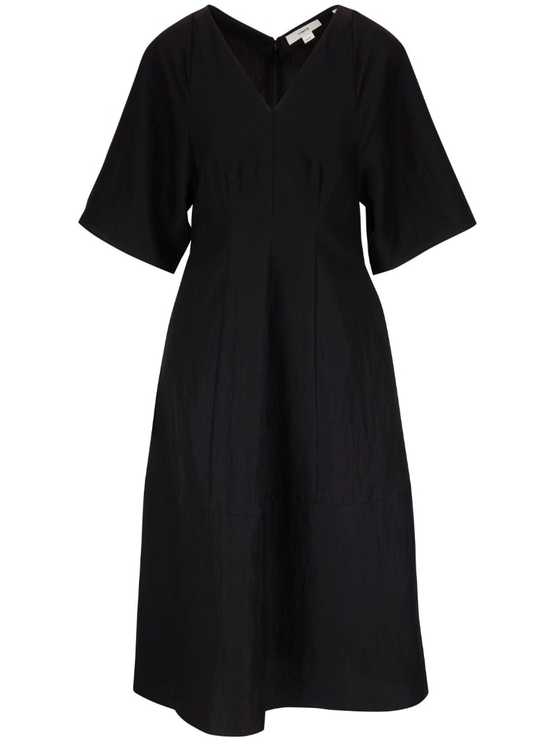V-neck fitted dress Highlights - Black - Lyocell - V-neck - Fitted waistline - Short sleeves - Flared hem - Mid-length - This item contains at least 50% materials which are certified or widely recognised as having a lower environmental impact through production and/or manufacturing processes that reduce water consumption and the use of harmful chemicals, or re-use by-products of the production process. - Learn more about what makes a product conscious on our conscious criteria page Made in United States Composition Lyocell 91%, Nylon 9%