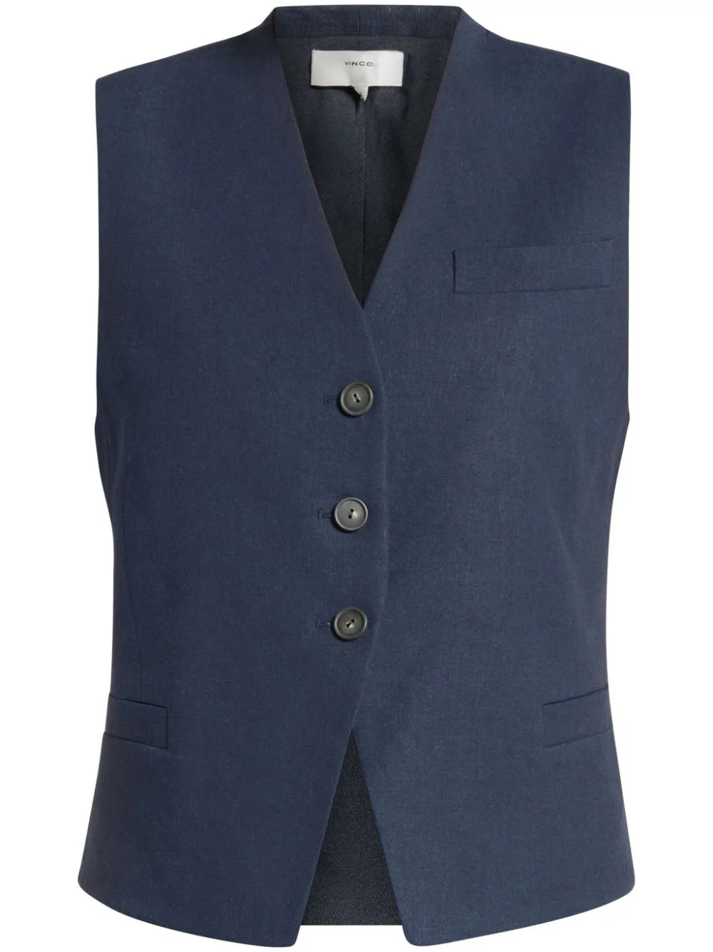 V-neck waistcoat Highlights - Navy blue - Linen blend - V-neck - Front button fastening - Sleeveless - Chest welt pocket - Two side welt pockets - Adjustable strap to the rear - Straight hem Imported Composition Linen/Flax 64%, Rayon 33%, Spandex/Elastane 3%