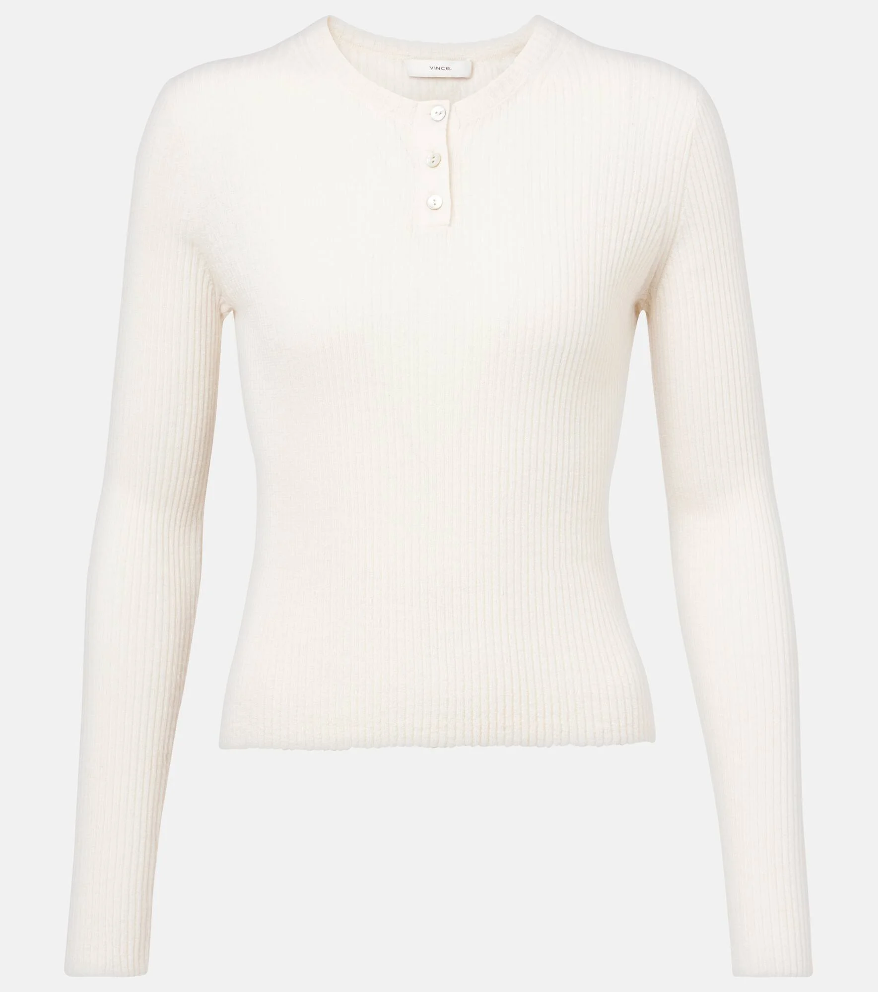 Made from soft cashmere and silk, this Henley shirt from Vince is the epitome of everyday luxury. This lightweight, ribbed-knit piece is designed to fit the figure. Product Details - Material: 70% cashmere, 30% silk - Care instructions: dry clean - Made in China - Designer color name: Off White - Item color: white - Closure: partially buttoned front - Sleeves: long-sleeved - Slim fit - Length: regular (hip-length) - Item number: P01058947 Size & Fit - True to size - Semi-sheer - Fitted - Stretchy fabric - Falls to the hip - The model seen in the picture is 178cm-5'10" and wearing a size XS