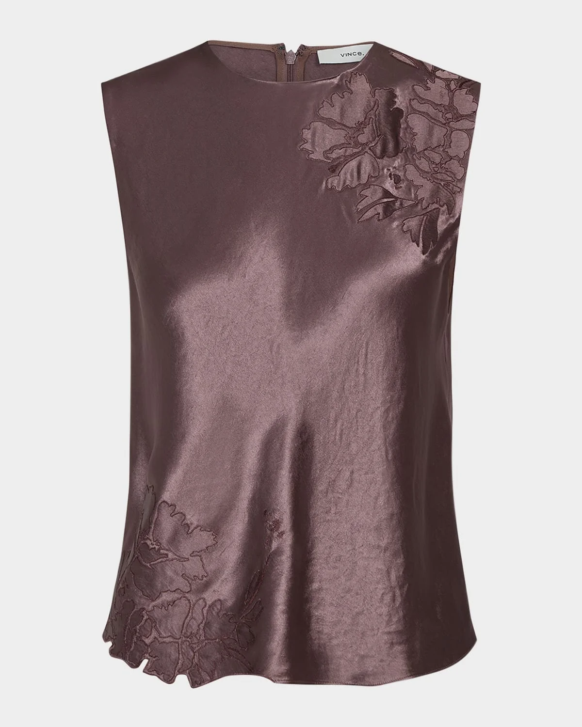 Crafted from lustrous satin, this blouse by Vince is artfully embroidered with tonal flowers around the shoulder and hem Approx. 21.3"L from shoulder to hem Crew neckline Sleeveless Hip length Invisible back zipper Acetate Hand wash cold or dry clean Imported