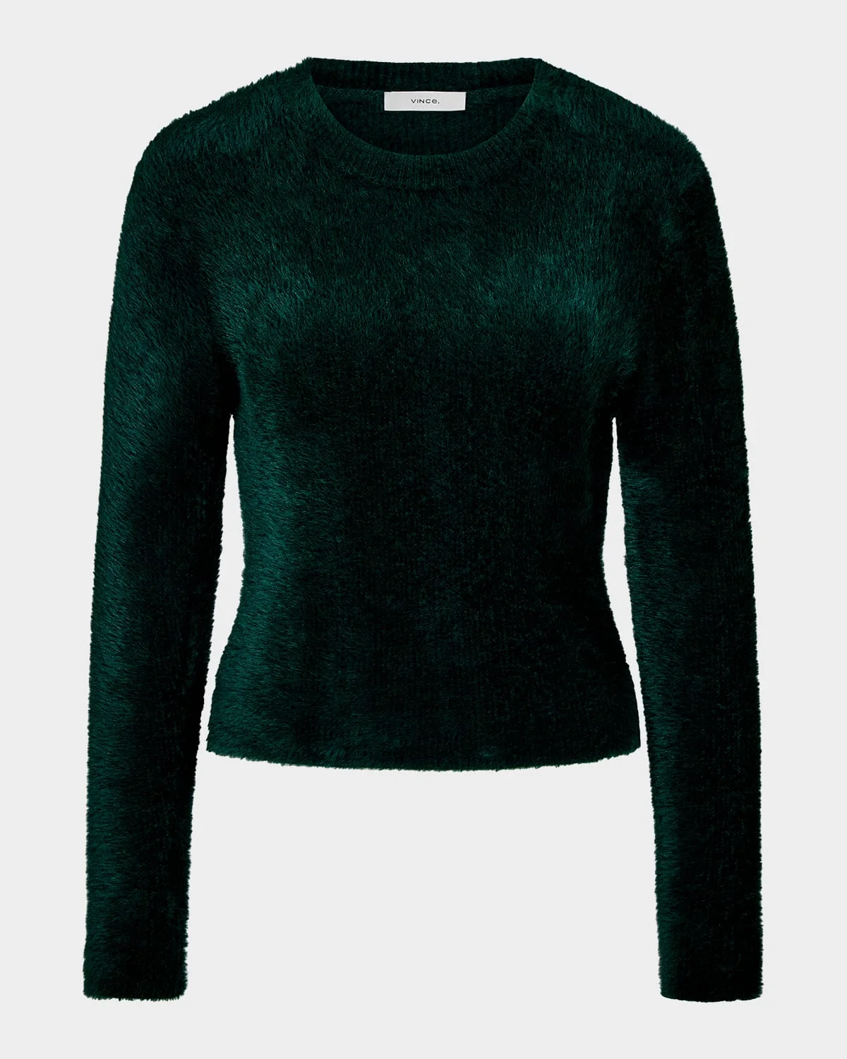 Fuzzy eyelash knit sweater by Vince. Crew neckline Long sleeves Classic fit Hem sits at the hip Pullover style Nylon/polyamide/polyester/metallic fibers Hand wash or dry clean Imported