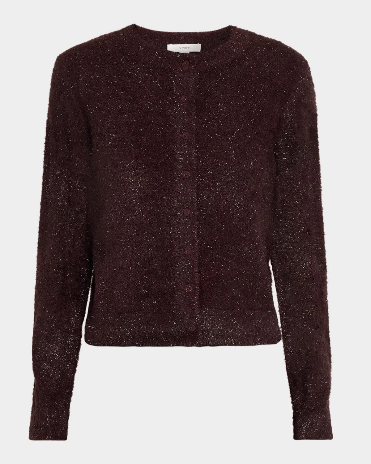 Soft eyelash knit cardigan adorned with shimmering tinsel by Vince. Crew neckline Long sleeves Classic fit Hem sits at the hip Buttonfront Nylon/polyamide/polyester Hand wash or dry clean Imported