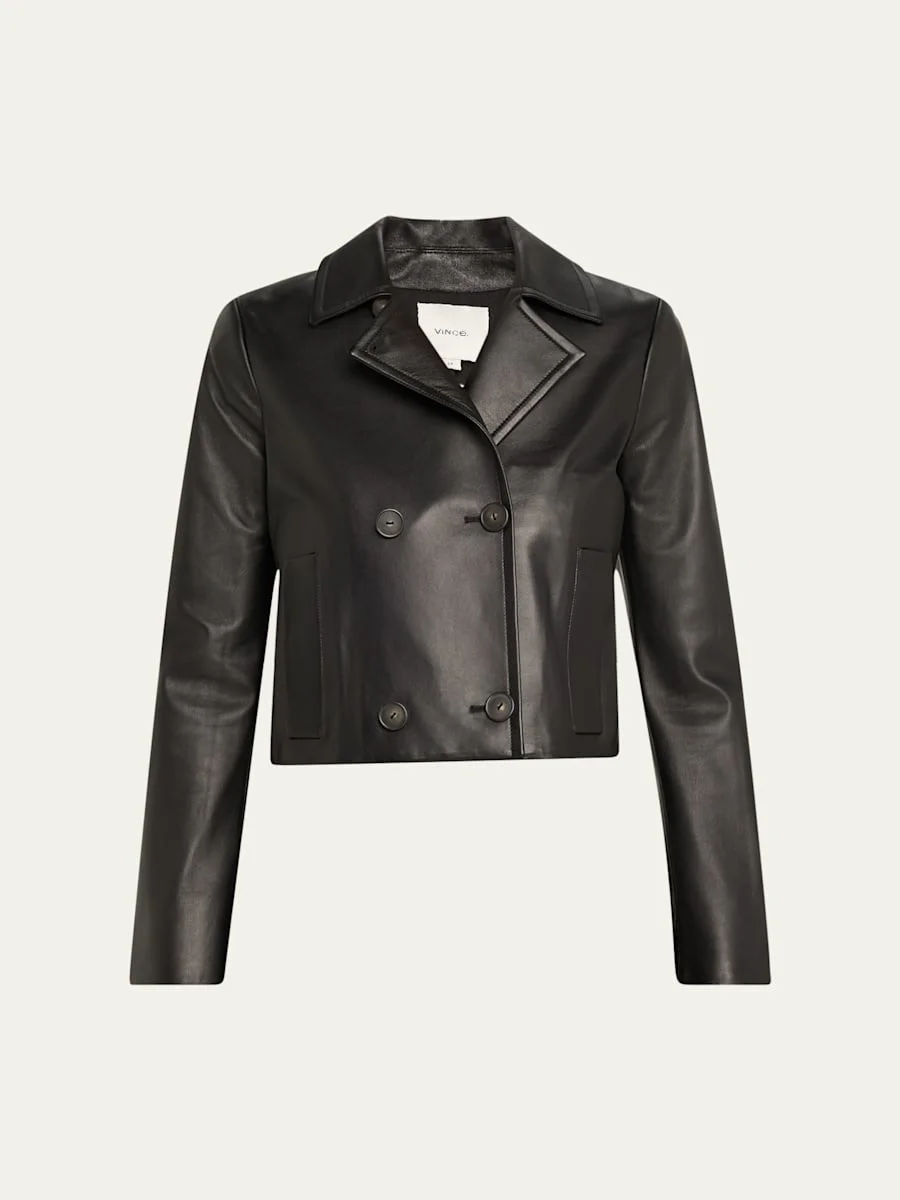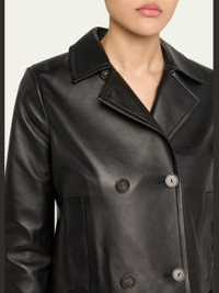 Vince smooth goat leather peacoat Notch collar Doublebreasted front Long sleeves Side pockets Shrunken fit Buttonfront Leather Lining: Polyester Leather method dry cleaning Imported