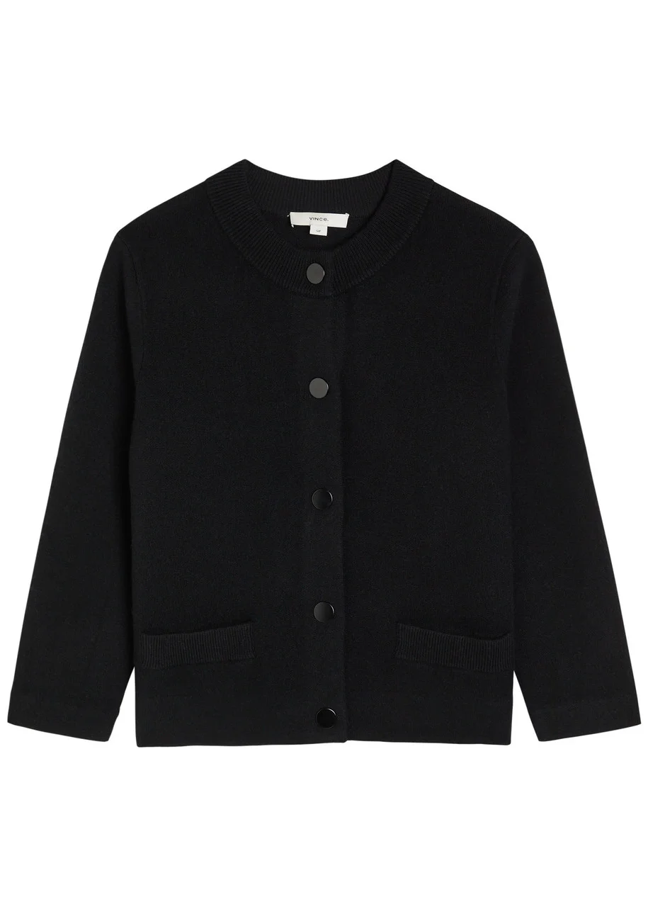 Info & Care Vince wool-blend cardigan Round-neck, front patch pockets, ribbed trims; Press-stud fastening through front; 35% wool, 32% cotton, 17% nylon, 15% cashmere, 1% spandex; Hand wash; Size & Fit Length shoulder to hem: 20 inches/ 51cm; Midweight Relaxed, boxy fit Model is 5'9"/ 175cm and wears a size small