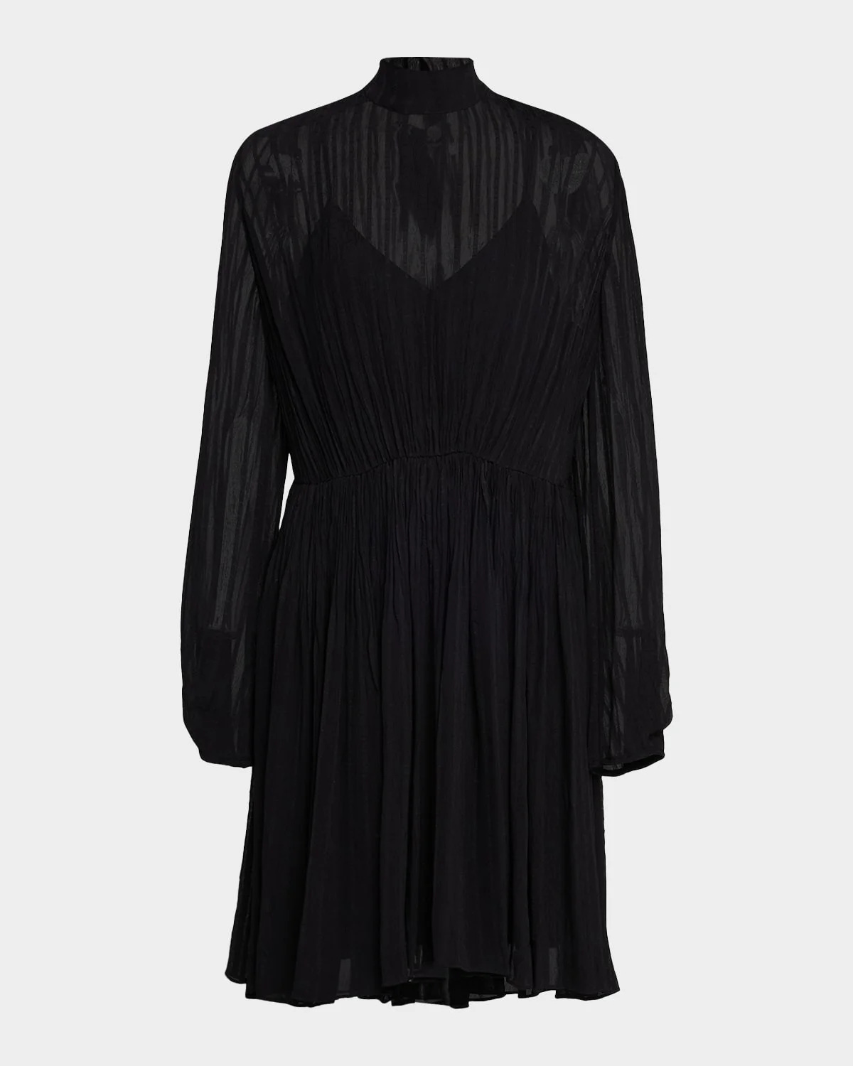 Vince crinkled mini dress adorned with tonal stripes Mock neckline Long sleeves with button cuffs Aline silhouette Hem falls above the knee Center back zip Viscose Lining: Polyester Dry clean Imported