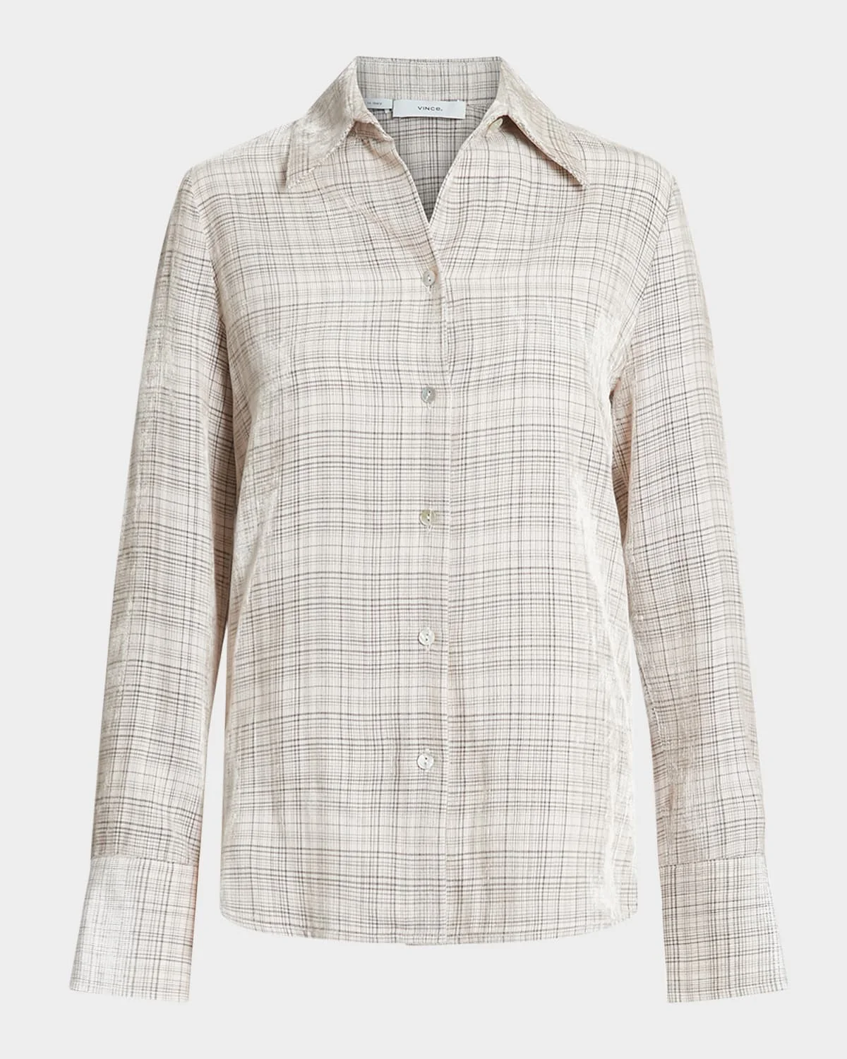 Vince textured plaid shirt Point collar Long sleeves with button cuffs Classic fit Rounded hem Buttonfront Viscose Imported