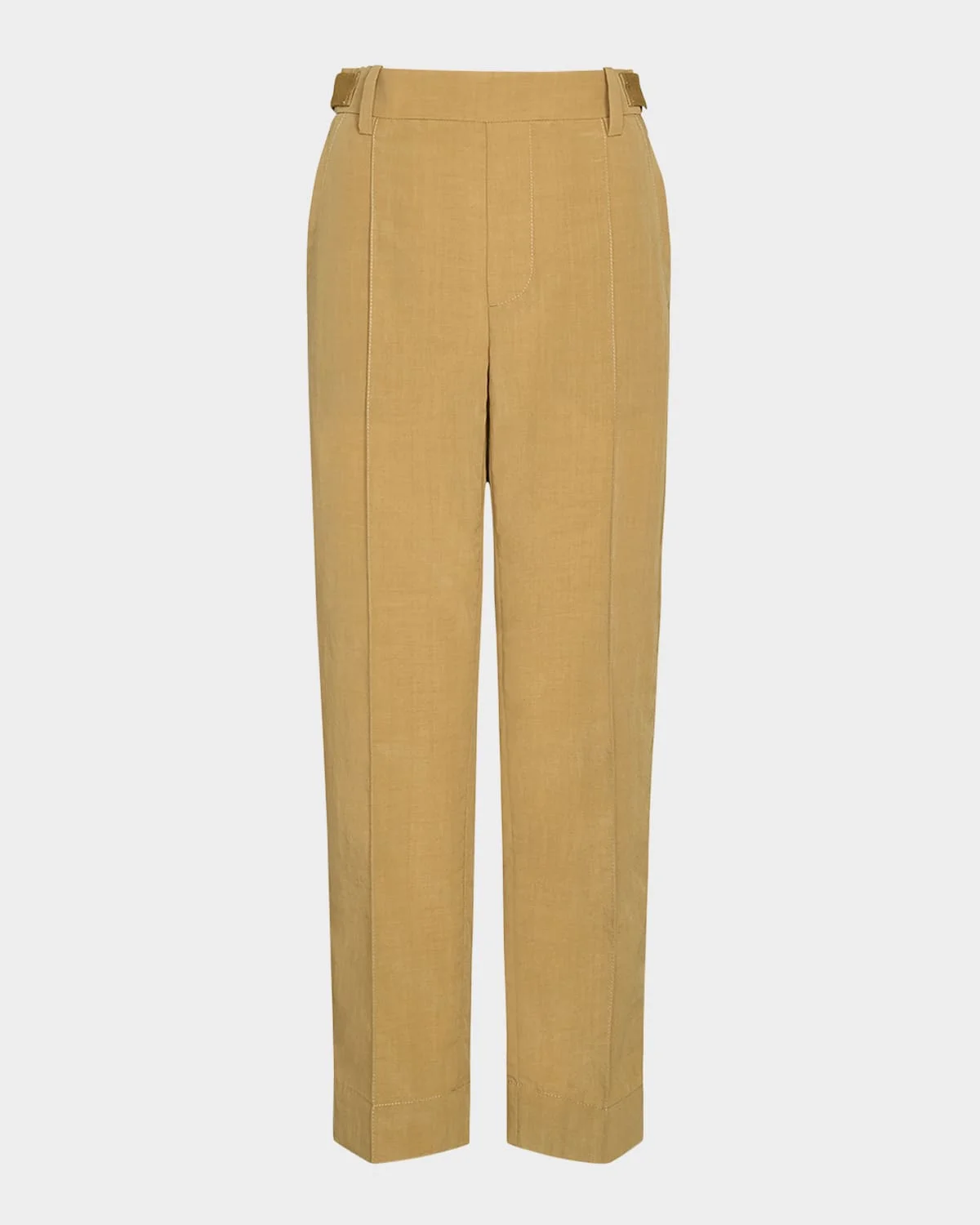 - Vince pintuck pants with adjustable side tabs - Mid-rise; sits high on the hip - Back elastic waistband - Four-pocket style - Straight legs - Cropped length - Pull-on style - Lyocell/nylon/polyamide/wool - Hand wash or dry clean - Imported