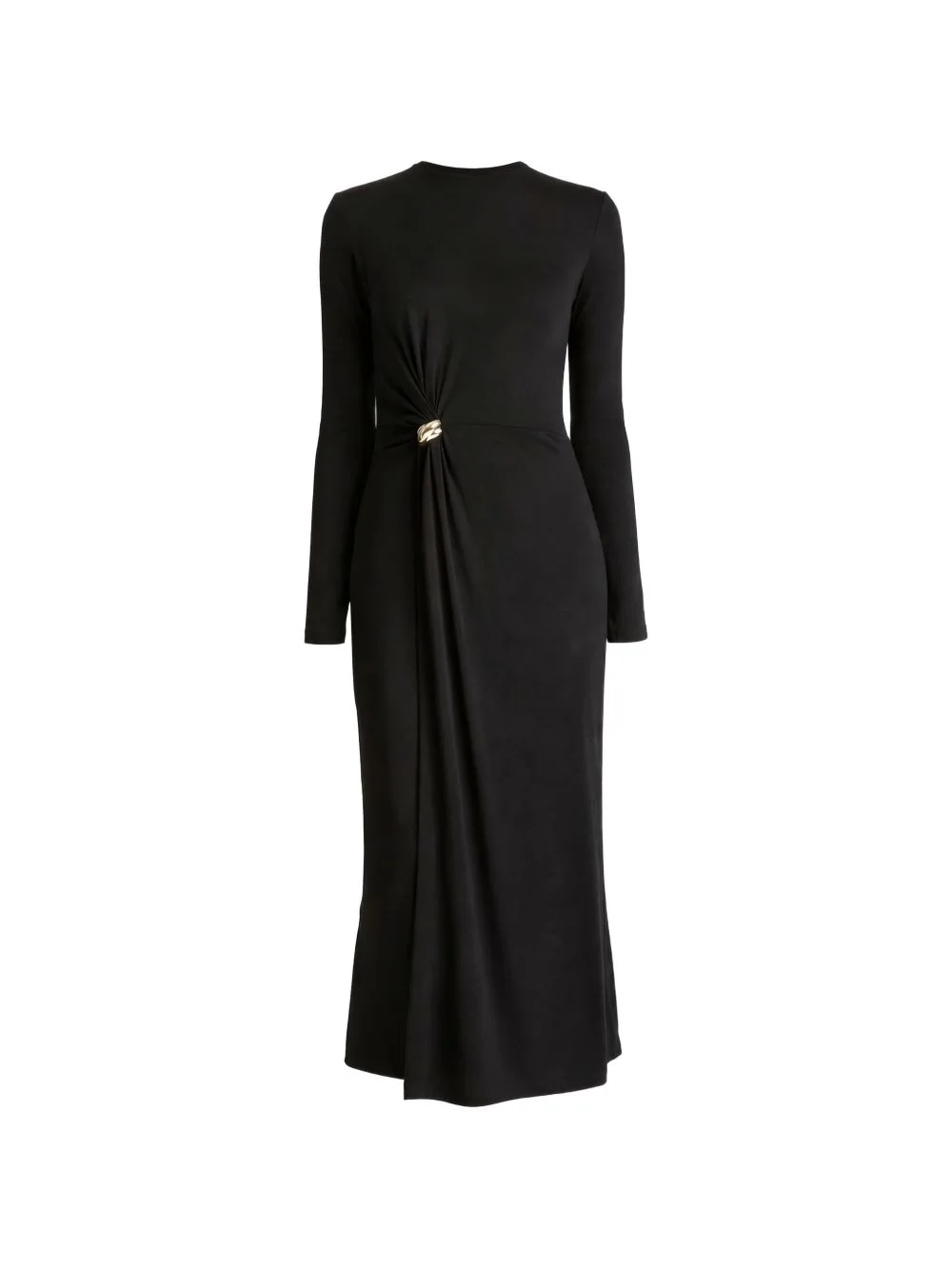 side drape midi dress Highlights - Black - Long sleeves - Gold-tone detailing - Draped detailing - Round neck - Concealed zip fastening Imported Composition Wool 53%, Polyester 47% Washing instructions Read Manufacturer Guidelines