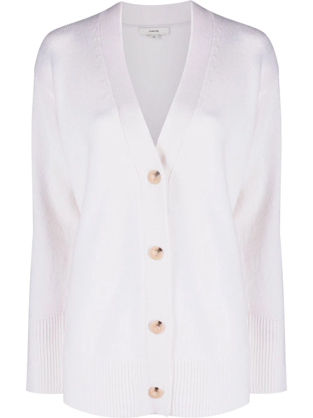 Weekend V-neck ribbed cardigan A signature style of the Los Angeles-based brand Vince, the Weekend cardigan is crafted from soft wool and cashmere and designed in a classic V-neck silhouette. This iteration is presented in a pure white hue, contributing to its timeless appeal. Made in United States Composition Wool 90%, Cashmere 10% SIZE & FIT Model measurements Height 5 ft 10 in(1.77 m) Bust/Chest 31.49 in(80 cm) Hips 33.85 in(86 cm) Waist 22.44 in(57 cm) Measurement CHEST 44.88 in(114 cm) SLEEVE LENGTH 20.86 in(53 cm) LENGTH 26.77 in(68 cm) FittingInformation This piece fits true to size. We recommend you get your regular size Cut for a loose fit Made with a mid-weight fabric Washing instructions Hand Wash