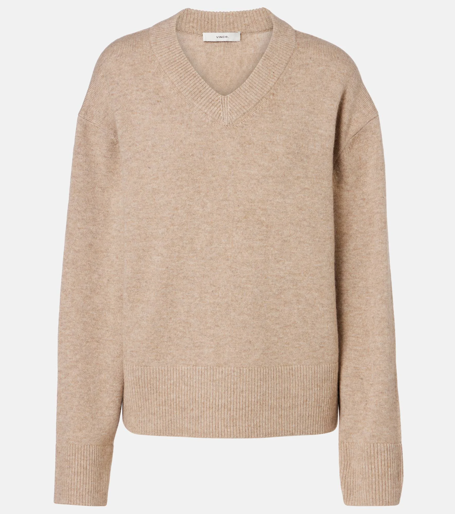 Look to Vince when building a timeless wardrobe of elevated yet understated styles. This sweater is knitted from a soft wool blend, finished with ribbed-knit trims at the V-neckline, hem, and cuffs. Product Details - Material: 66% wool, 26% cashmere, 7% nylon, 1% elastane - Care instructions: hand wash cold - Made in China - Color: beige - Designer color name: H Marzipan - Item color: beige - Trim: 68% wool, 26% cashmere, 5% nylon, 1% elastane - Collar: V-neck - Cuff: ribbed - Hem: ribbed - Item number: P01123976 Size & Fit - True to size - Dropped shoulders - Straight fit - Stretchy fabric - Falls to the hip - The model seen in the picture is 178cm-5'10" and wearing a size XS