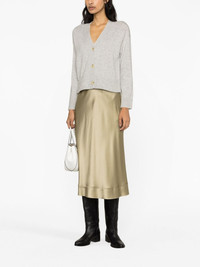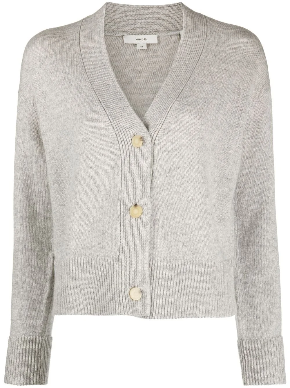 wool-cashmere blend cardigan Vince is synonymous with 'understates pieces for every day', as illustrated with this grey cardigan. It’s spun from a plush blend of wool and cashmere to a boxy silhouette traced with a trio of buttons. Highlights - Light grey - Wool-cashmere blend - V-neck - Front button fastening - Drop shoulder - Long sleeves - Ribbed cuffs - Ribbed hem Imported Composition Wool 70%, Cashmere 30% SIZE & FIT Model measurements Height 5 ft 10 in(1.78 m) Bust/Chest 31.49 in(80 cm) Hips 35.03 in(89 cm) Waist 23.62 in(60 cm) Measurement CHEST 45.66 in(116 cm) LENGTH 22.83 in(58 cm) SLEEVE LENGTH 19.68 in(50 cm) FittingInformation Designed for a relaxed fit, this piece allows for comfort and movement when worn Made with a midweight knit, this piece offers some stretch This piece fits true to size – take your usual size