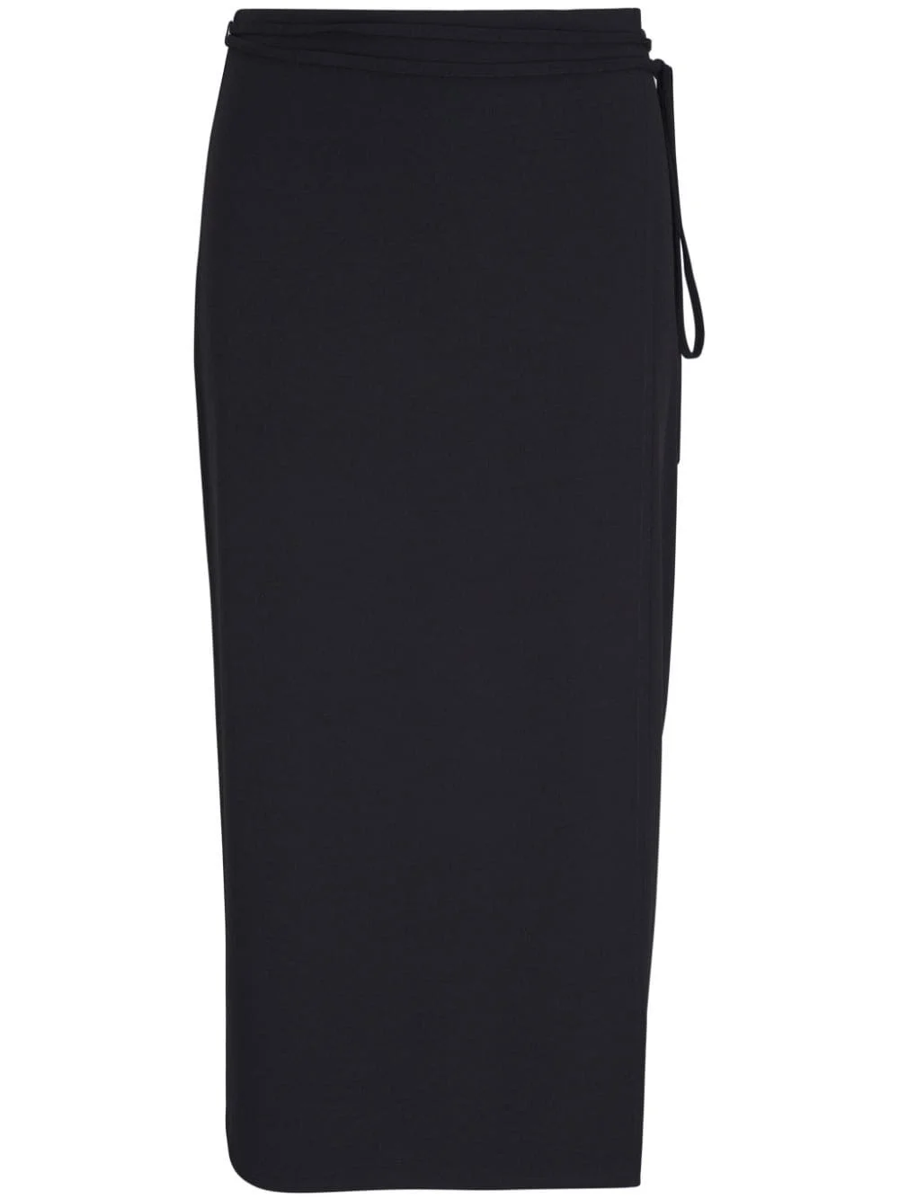 tie-fastening wrap midi skirt Highlights - Black - Stretch-design - Jersey texture - Wrap design - Self-tie fastening - Slip-on style - Mid-length Made in United States Composition Polyester 95%, Spandex/Elastane 5%