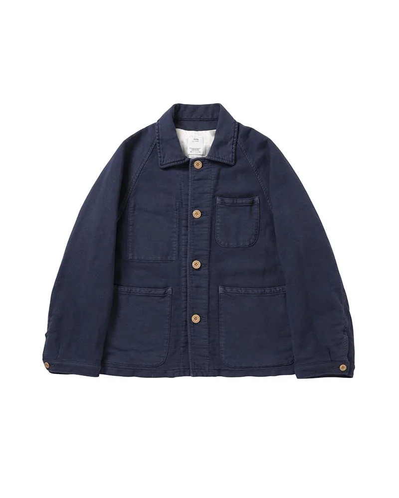 COVERALL MOLESKIN DMGD W COLOR: BLACK, BLUE SIZE: 00, 0, 1, 2, 3 Custom Moleskin Wool Linen Cotton Blend Jacket Garment Dyed and Damaged Finish Custom Water Buffalo Buttons 44% Wool 30% Linen 26% Cotton UNIT:cm : Please be aware that there may be slight variations in the color of the fabric and pattern than shown in the images. There will be slight shrinkage when washing for the first time. SIZE LENGTH CHEST SLEEVE 00 61 103.5 74 0 63 103.5 77 1 64.5 107.5 79 2 66 112.5 81.2 3 67.5 117.5 83.4