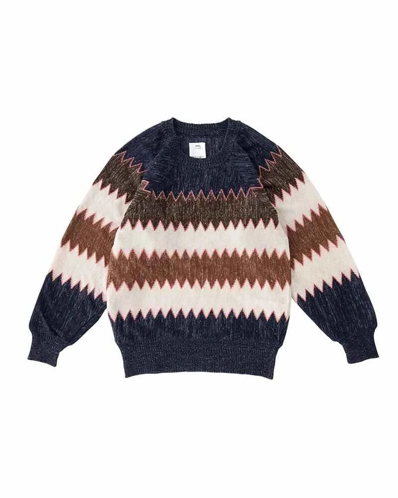 CREW KNIT W ZIG-ZAG COLOR: NAVY, IVORY SIZE: 0, 1, 2, 3 Crew neck sweater knitted from wool and linen Pressed finish 64% Wool , 36% Linen SIZE 0 : Length 23.6 , Sleeve 29.3 , Chest 32.2 (inch) SIZE 1 : Length 24.4 , Sleeve 30.2 , Chest 33.3 (inch) SIZE 2 : Length 25.1 , Sleeve 31.2 , Chest 34.5 (inch) SIZE 3 : Length 25.9 , Sleeve 32.2 , Chest 35.7 (inch) Please be aware that the fabric used may vary in color and pattern from item to item. Products may shrink slightly when washed.