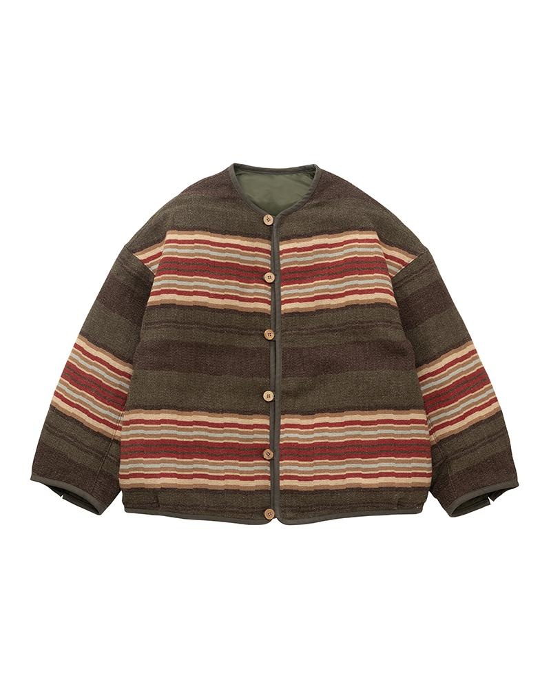 LINER JKT (JACQUARD BLANKET) W COLOR: BROWN, BEIGE SIZE: 00, 0, 1, 2, 3 Custom Blanket Wool, Linen, and Cotton Liner Jacket *Reversible Pressed Finish White Goose Down Fill Custom Water Buffalo Buttons 49% Wool 44% Linen 7% Cotton UNIT:cm Please be aware that there may be slight variations in the color of the fabric and pattern than shown in the images. There will be slight shrinkage when washing for the first time. SIZE LENGTH CHEST SHOULDER SLEEVE 00 63.5 120 64 44.5 0 65.5 120 64 46.5 1 67 124 65.5 47.7 2 68.5 129 67.5 48.9 3 70 134 69.5 50.1