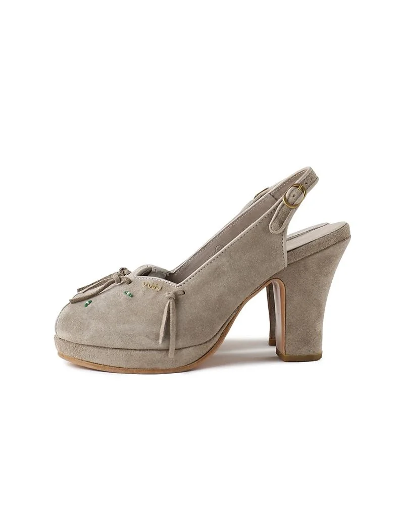 PIKANI HEEL SANDAL-FOLK W COLOR : SAND , OLIVE SIZE : W6 , W7 , W8 , W9 , W10 (US) UPPER : Italian calf suede OUTSOLE : Handmade wood outsole and Vibram® outsole REPLACEABLE OUTSOLE : No Leather lining Specially processed brass buckle Please Note : The fit may vary depending on the type, design and material of the shoe. The natural leather has been specially treated to give it a unique texture. As a result, wrinkles and other imperfections can be observed, and the expression, texture and color of each item varies slightly. Please also note that the colors and patterns of the fabrics used may differ slightly from the image.
