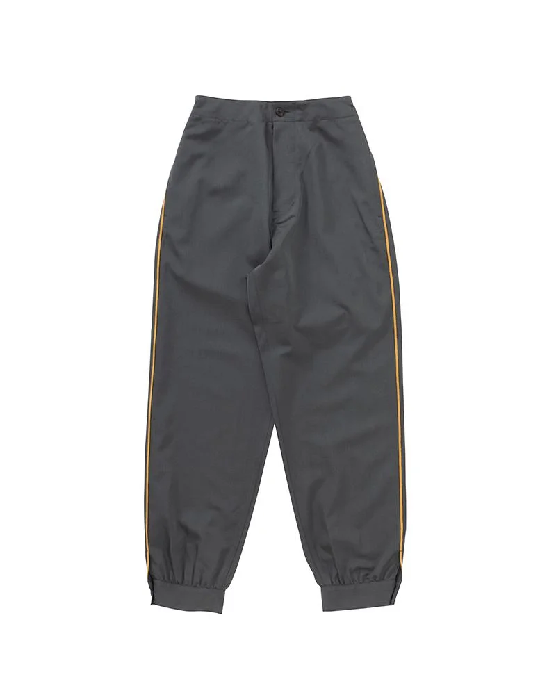 PIPING PANTS W COLOR: BLACK, GREEN SIZE: 00, 0, 1, 2, 3 Custom High Density Weave Army Twill Wool Silk Blend Pants Pressed Finish Custom Water Buffalo Buttons and Zip Fastener 62% Wool 38% Silk UNIT:cm : Please be aware that there may be slight variations in the color of the fabric and pattern than shown in the images. There will be slight shrinkage when washing for the first time. SIZE LENGTH INSEAM WAIST THIGH WIDTH HEM 00 99 68 66 36 15.5 0 104 73 66 36 15.5 1 105.5 74 70 37 16.5 2 107 75 74 38 17.5 3 108.5 76 78 39 18.5