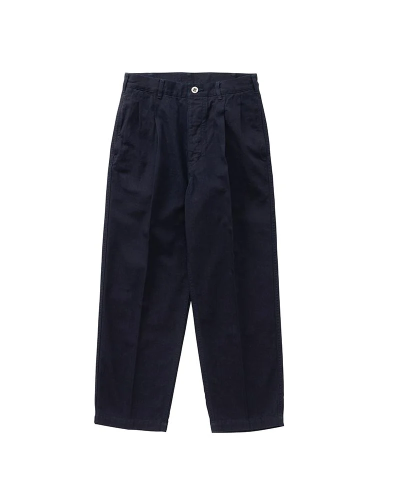 PLEATED WIDE CHINO W COLOR: DK.INDIGO, LT.INDIGO SIZE: 00, 0, 1, 2, 3 Custom High Density Weave Long Staple Cotton Chino Pants Custom Selvedge Detail Damage Processed Custom PEERLESS Metal Buttons 100% Cotton Made in Japan UNIT:cm : SIZE LENGTH INSEAM WAIST THIGH WIDTH HEM 00 84 56.5 76 31.5 20.2 0 88 60.5 76 31.5 20.2 1 89.5 61.5 80 32.7 21.2 2 91 62.5 84 33.9 22.2 3 92.5 63.5 88 35.1 23.2