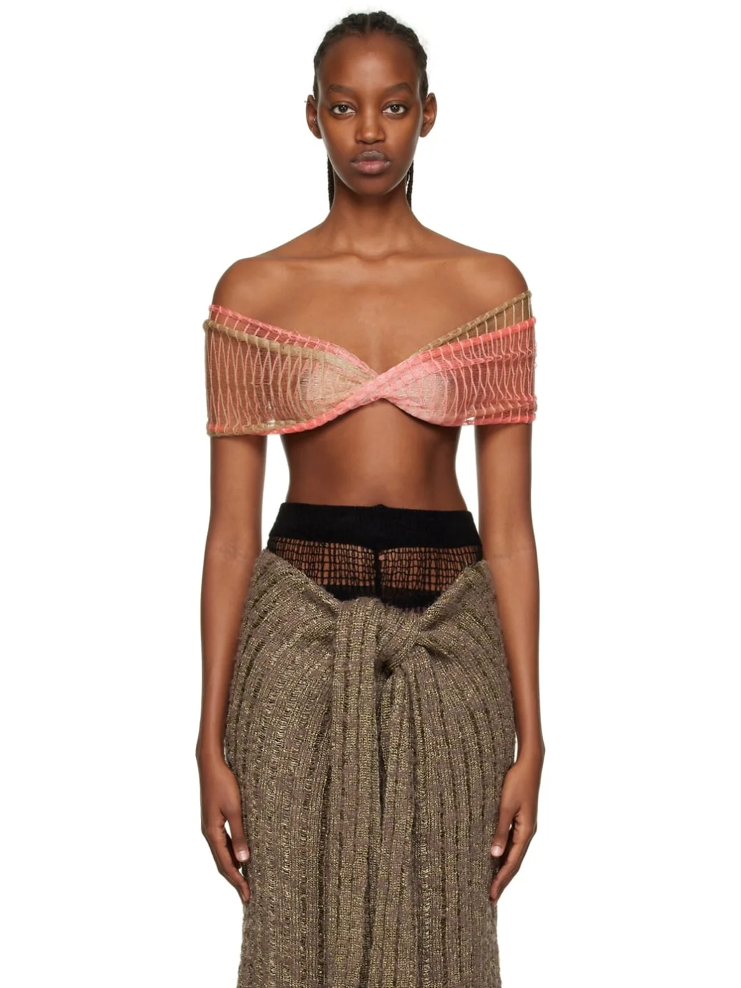 Semi-sheer knit viscose and polyester-blend camisole. Laddering throughout. · Off-the-shoulder and layered construction · Twisted detailing at front and back Supplier color: Pink/Beige 75% viscose, 25% polyester. Made in Italy 222021F096013