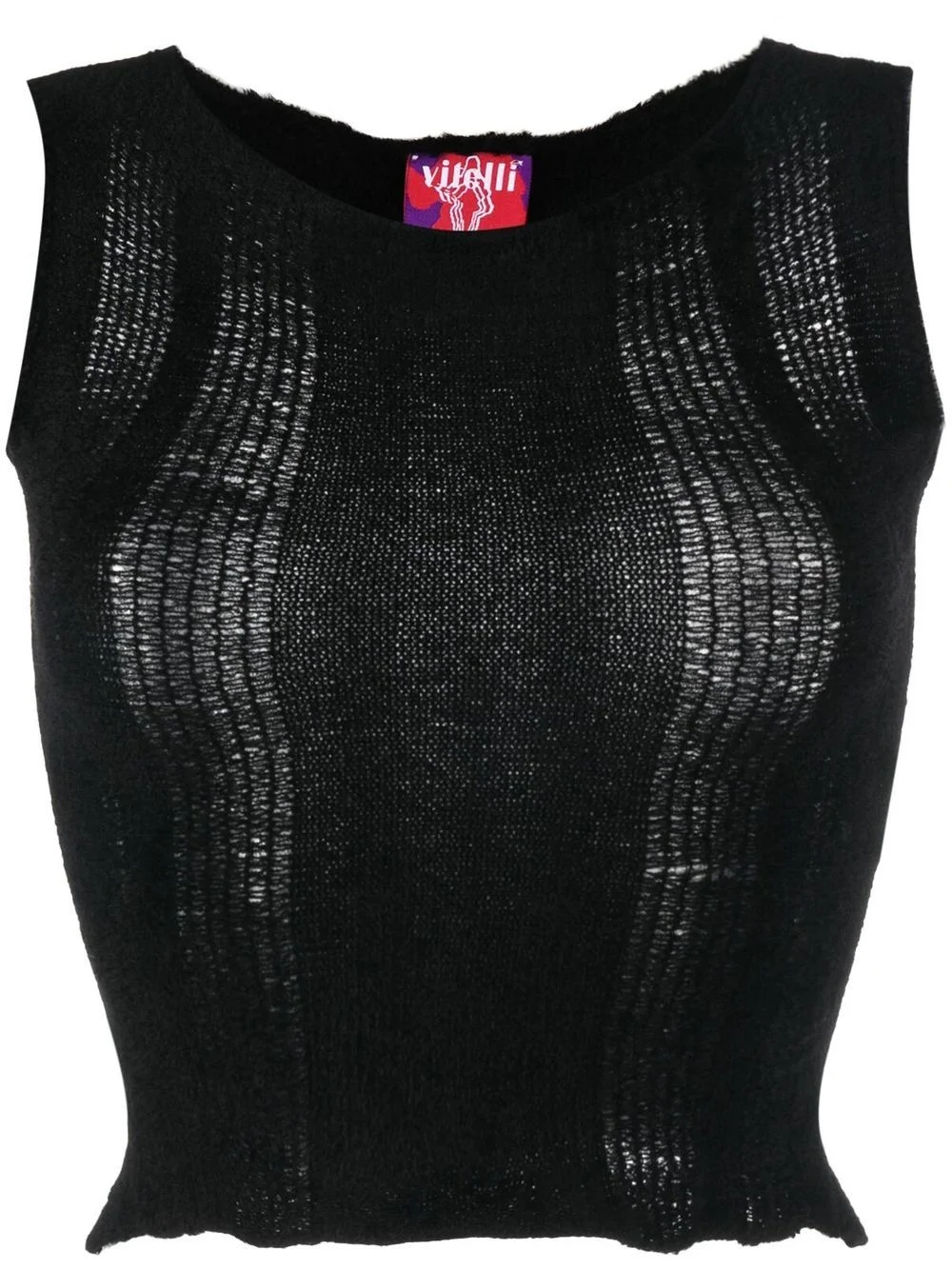 semi-sheer knit cropped top Highlights - Black - Cotton/linen - Semi-sheer construction - Round neck - Sleeveless - Cropped Made in Italy Composition Polyester 100%, Viscose 100%, Cotton 100%, Linen/Flax 100% SIZE & FIT Model measurements Height 5 ft 10 in(1.78 m) Bust/Chest 31.49 in(80 cm) Hips 36.22 in(92 cm) Waist 25.59 in(65 cm) FittingInformation This piece fits true to size. We recommend you get your regular size Cut for a close fit Made with a lightweight fabric