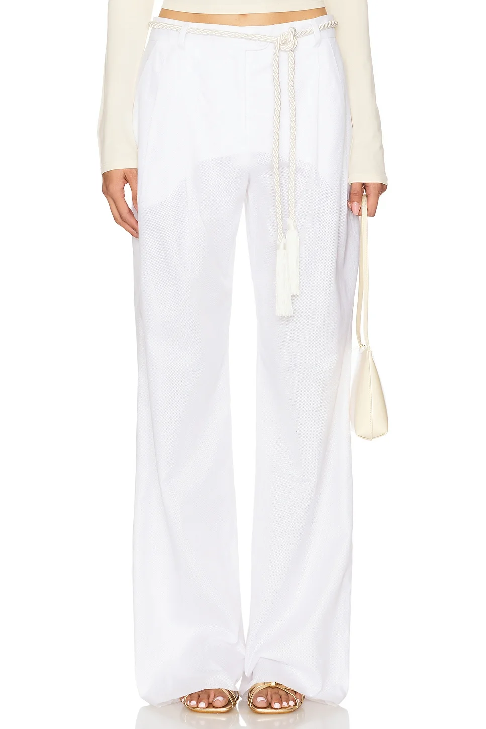 - Self: 100% polyester Lining: 97% cotton 3% elastane - Hand wash - Zip fly with button closure - Optional cord belt styling with tie closure and fringed tassel ends - Side seam pockets - Back button pockets - Midweight leno fabric.22" at the knee and 22" at the leg opening - Revolve Style No. VETT-WP2 - Manufacturer Style No. VS1PA0070-TE079