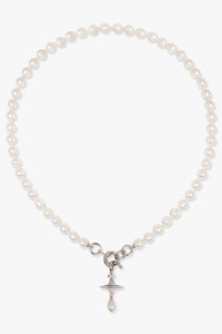 The stunning Aleksa Pearl Necklace from Vivienne Westwood features a row of 8mm creamrose glass-based baroque pearls, each pearl is hand-knotted on the thread. A spring lock fastens the necklace securely at the front of the piece, from which hangs a 3d classic orb set with crystals, with a baroque pearl in the Saturn rings centre and a single baroque pearl drop, as the feature. Fabrication: 100% Brass Made in Thailand