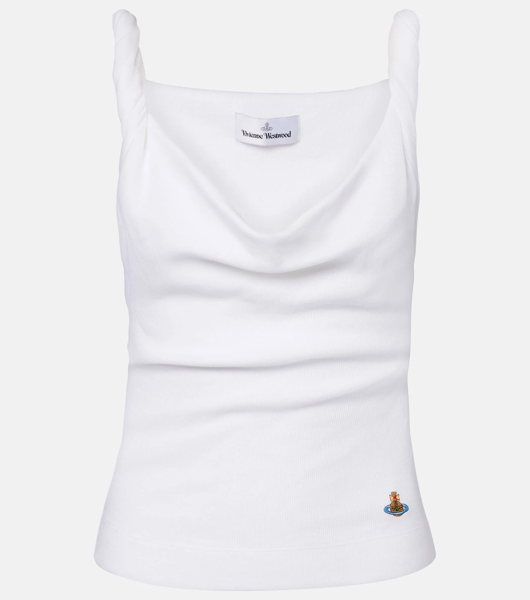 Vivienne Westwood’s designs continue to exemplify the disruptive energy of its late founder – fashion’s original punk pioneer. Made from cotton-blend jersey, the Anna tank top has a cowl neckline, twisted straps, and the brand's iconic Orb logo at its bottom left. Product Details - Material: 95% cotton, 5% elastane - Care instructions: machine wash at 30 degrees - Made in Tunisia - Color: white - Designer color name: White - Collar: cowl neck - Item number: P01121194 Size & Fit - True to size - Off-the-shoulder - Cinched waist - Slightly stretchy fabric - Slightly cropped - The model seen in the picture is 178cm-5'10" and wearing a size XS