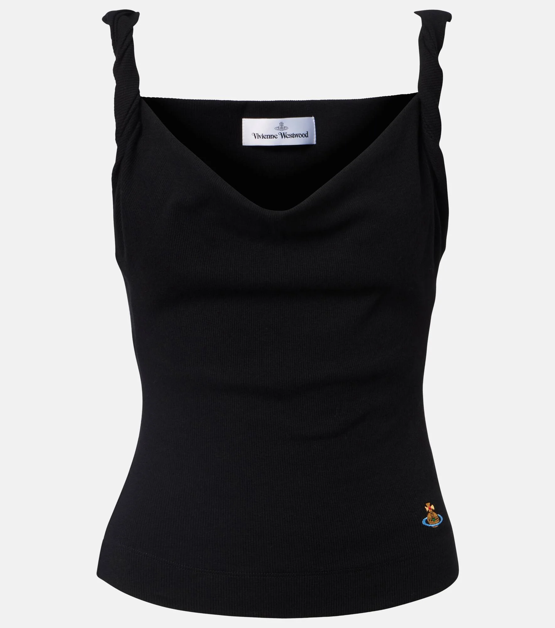 Vivienne Westwood’s designs continue to exemplify the disruptive energy of its late founder – fashion’s original punk pioneer. Made from black cotton, the Anna tank top has a cowl neckline, twisted straps, and the brand's iconic Orb logo at its bottom left. Product Details - Material: 99% cotton, 1% elastane - Care instructions: machine wash at 30 degrees - Made in Tunisia - Color: black - Designer color name: Black - Item number: P01121196 Size & Fit - True to size - Off-the-shoulder - Cinched waist - Slightly stretchy fabric - Slightly cropped - The model seen in the picture is 178cm-5'10" and wearing a size XS