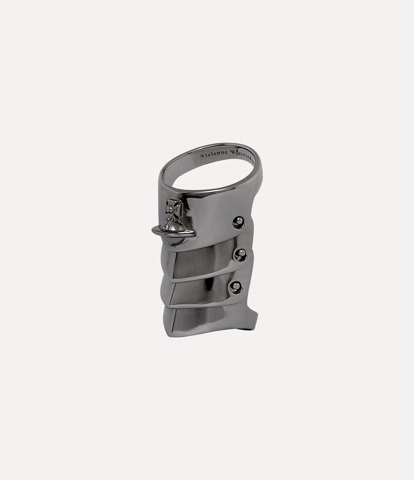 Our Armour ring showcases articulated sections that are crafted to adapt to the movement of the finger, drawing inspiration from the protective plates found on armadillos. The base metal ring is embellished with four sterling silver sections that overlap, overlaid with our orb motif. Code: 64030003-01S001-IM-RUTHENIUM - Gunmetal-tone plating - Orb motif - Thick-band design - Hinged - Engraved inner - Weight: 25.5g - Measurements: face height 3.8cm COMPOSITION - 100% Recycled silver
