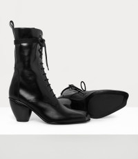 Our Army boots are crafted from smooth, glossy leather for a polished finish. The design features our newly developed anatomical silhouette, reminiscent of the house's signature 'Animal Toe' motif - first revealed in the ‘Summertime’ collection of Spring-Summer 2000. Code: 7101007LW-L004K--BLACK - Features a lace-up front fastening - High-shine finish - Mid-calf height - Pull tab at the back - Minimal seam detailing - Wrapped ankle tie detail - Polished eyelets - Cone heel: 6.5cm - Made in Italy COMPOSITION - 100% Leather