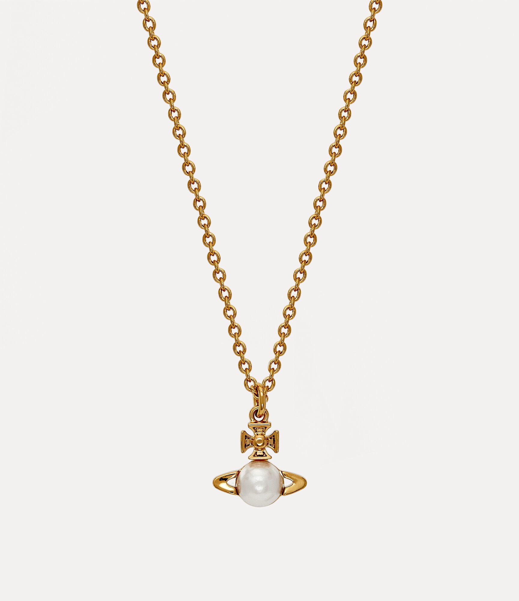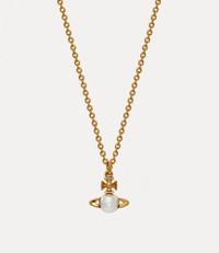The Balbina Pendant necklace features a gold-tone plating and a glass-based pearl at the centre of the orb. It is fitted with an adjustable chain and a lobster-claw clasp, along with a tag that is stamped with our branding. Material 100% Brass Code: 6302032302R313R313 Details & Features Adjustable chain length: 40cm-44cm Orb dimensions: H 1cm x W 1cm Clasp closure