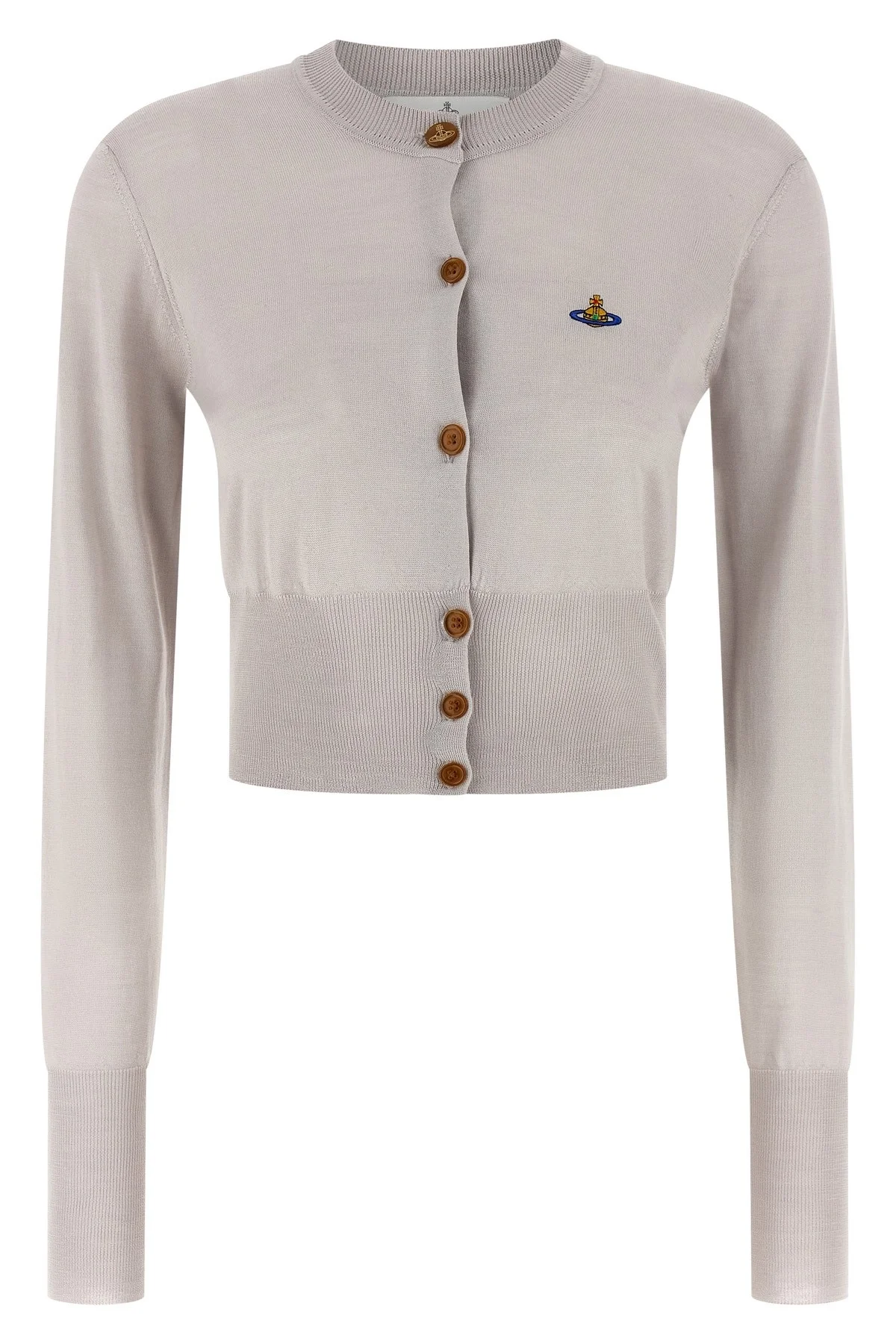 cod. 1803002UY001AP403 'Bea' cropped wool and silk cardigan with Orb logo embroidery and front button closure, round neckline, long cuffed sleeves. Color: Gray Size & Fit: true to size fit Composition: 70% wool, 30% silk Made in: Italy