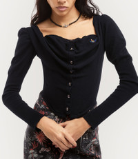 Our Bea Corset cardigan is crafted from a soft cotton-cashmere blend and fastens with shimmering mother-of-pearl buttons. Featuring a contrasting corset-style design and elegant drapery at the neckline, the piece is finished with intricately puffed shoulders for a sculptural silhouette. Code: 1803002V-Y001V--BLACK - Features our classic orb embroidery - Cropped design - Sweetheart neckline - Draped collar - Fitted body - Long, ribbed finishings - Contrasting corset - Woven label at the neckline - Made in Italy - Model is 5'10/178cm and is wearing size 38 COMPOSITION - 85% Cotton - 15% Cashmere