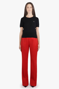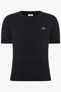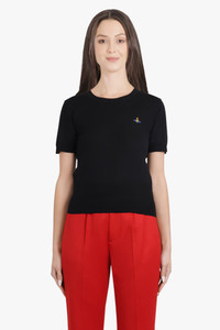 The Bea Short-Sleeve Knit Top is crafted from pure virgin wool in classic black, featuring a fitted, slightly cropped silhouette. High ribbed finishes at the waist create a structured look, while the multicoloured embroidered orb at the heart adds a signature Vivienne Westwood touch. - Fabrication: 100% virgin wool - Fitted silhouette with a slightly cropped length - Short sleeves for a versatile, trans-seasonal fit - High ribbed waistband for shape and structure - Round neckline for a timeless finish - Multicoloured embroidered orb emblem at the chest Style with high-waisted tailoring or skirts to balance its cropped proportions. Size and Fit Tiah: Model is 178cm/5’9” and is wearing a size S Model Measurements: Bust: 86cm, Waist: 69cm, Hips 90.5cm Fits true to size Measurements S: Bust 86cm, Waist 86cm, Hip 70cm, Length 56cm M: Bust 88cm, Waist 88cm, Hip 72cm, Length 56cm L: Bust 100cm, Waist 100cm, Hip 76cm, Length 56cm