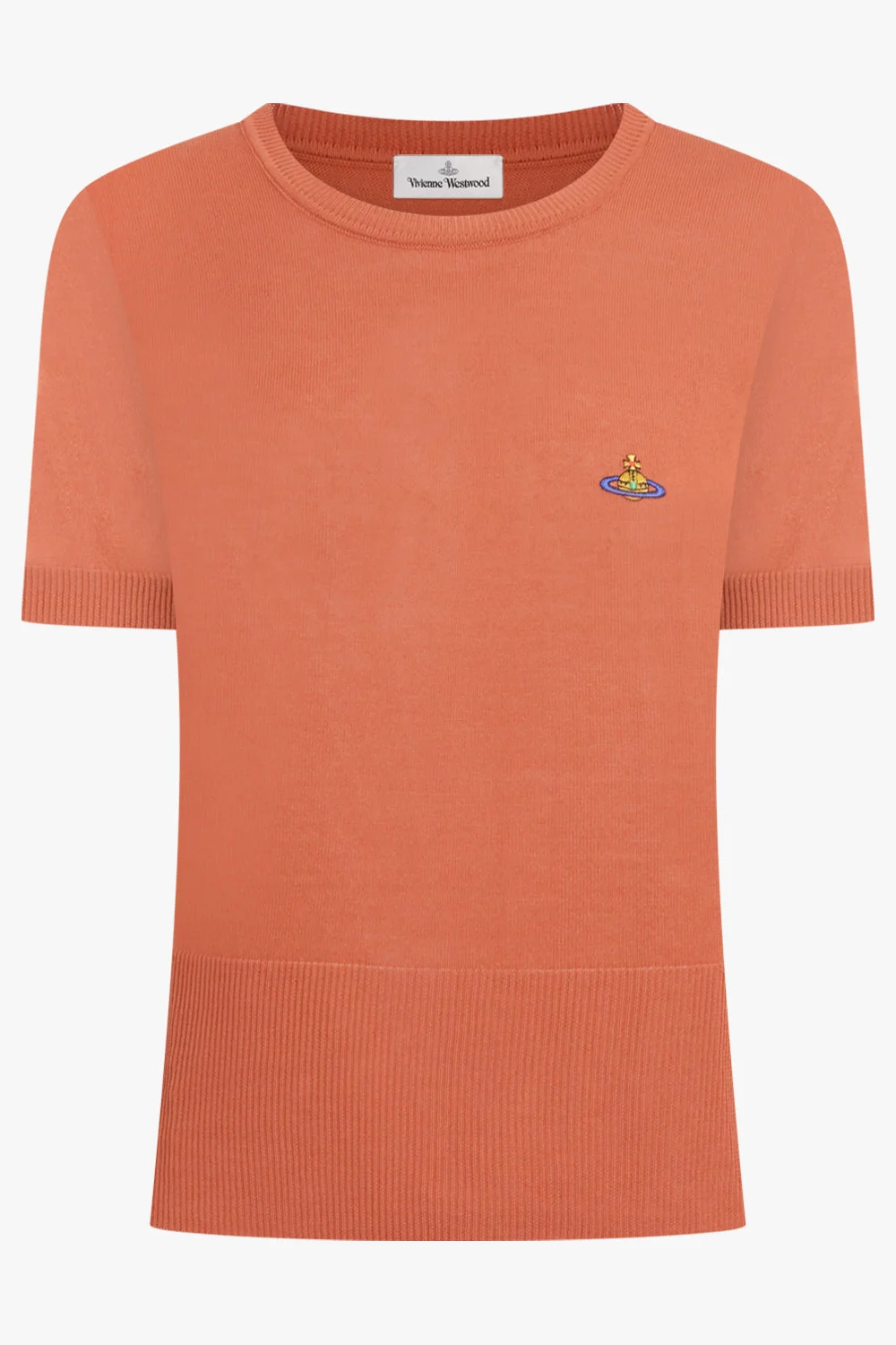 Vivienne Westwood’s Bea Top in Terrarosa refines a classic short-sleeve silhouette through proportion and detail. Crafted from soft cotton, the piece features a close, flattering fit with structured ribbing through the waist to enhance shape. A delicate orb embroidery at the chest anchors the design in the house’s heritage, offering a subtle point of recognition while maintaining a clean, wearable finish. Fabrication: 100% Cotton Soft, lightweight knit Fitted silhouette Short sleeve design Ribbed waist detailing Embroidered orb at chest Terrarosa colourway An elevated essential designed to integrate seamlessly into everyday dressing.