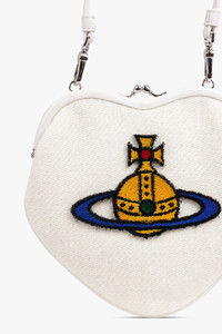 A whimsical yet refined reinterpretation of one of the house’s most iconic shapes, the Belle Heart Frame Orb Purse in Off White/Multi blends romantic curves with Vivienne Westwood’s unmistakable heritage codes. Crafted in a softly mottled wool that echoes the distinctive texture of Harris Tweed, the design is shaped into a sculptural heart silhouette, offering a playful sense of nostalgia elevated by artisanal detail. At the front, the multicoloured tufted Orb introduces a vibrant, tactile focal point, while the kiss-lock frame enhances its vintage-inspired charm. Complete with a removable chain strap and a structured top handle, the purse shifts effortlessly between evening elegance and expressive everyday styling. - Fabrication: - Heart-shaped silhouette with kiss-lock fastening - Removable chain strap for versatile styling - Detachable structured top handle - Compact size ideal for essentials Style it with crisp tailoring or a playful evening look to highlight its charming, collectible allure. Measurements Height: 20cm, Width: 20cm, Depth: 4cm
