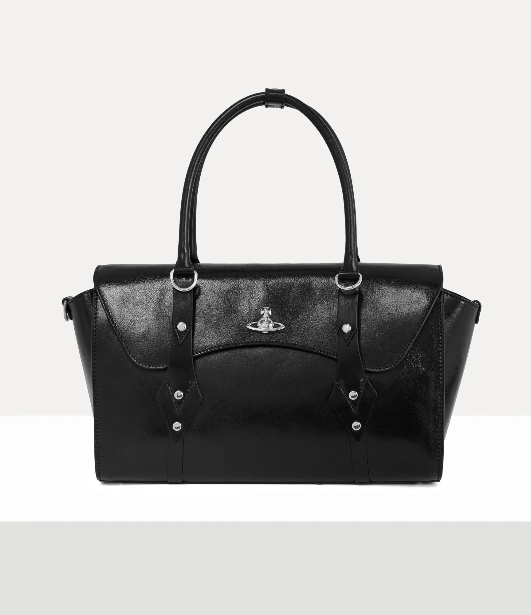 Our signature Bettina Medium handbag returns this season in shiny leather, complete with bondage-inspired polished hardware - echoing the design of the house’s signature Betty bag. Shaped to a soft silhouette, the piece is finished polished D-ring details at the base of the structural top handles. Code: 8053195450688 - Features polished hardware - Bas relief orb motif - Soft, fully lined interior - Extendable gussets - Tonal stitching - Zipped interior pocket - Removable strap - Magnetic snap fastening - Length: 37cm, height: 24cm, depth: 10cm - Made in Italy COMPOSITION - Main material: 100% cow leather - Lining: 65% cotton, 35% polyurethane