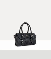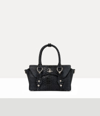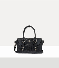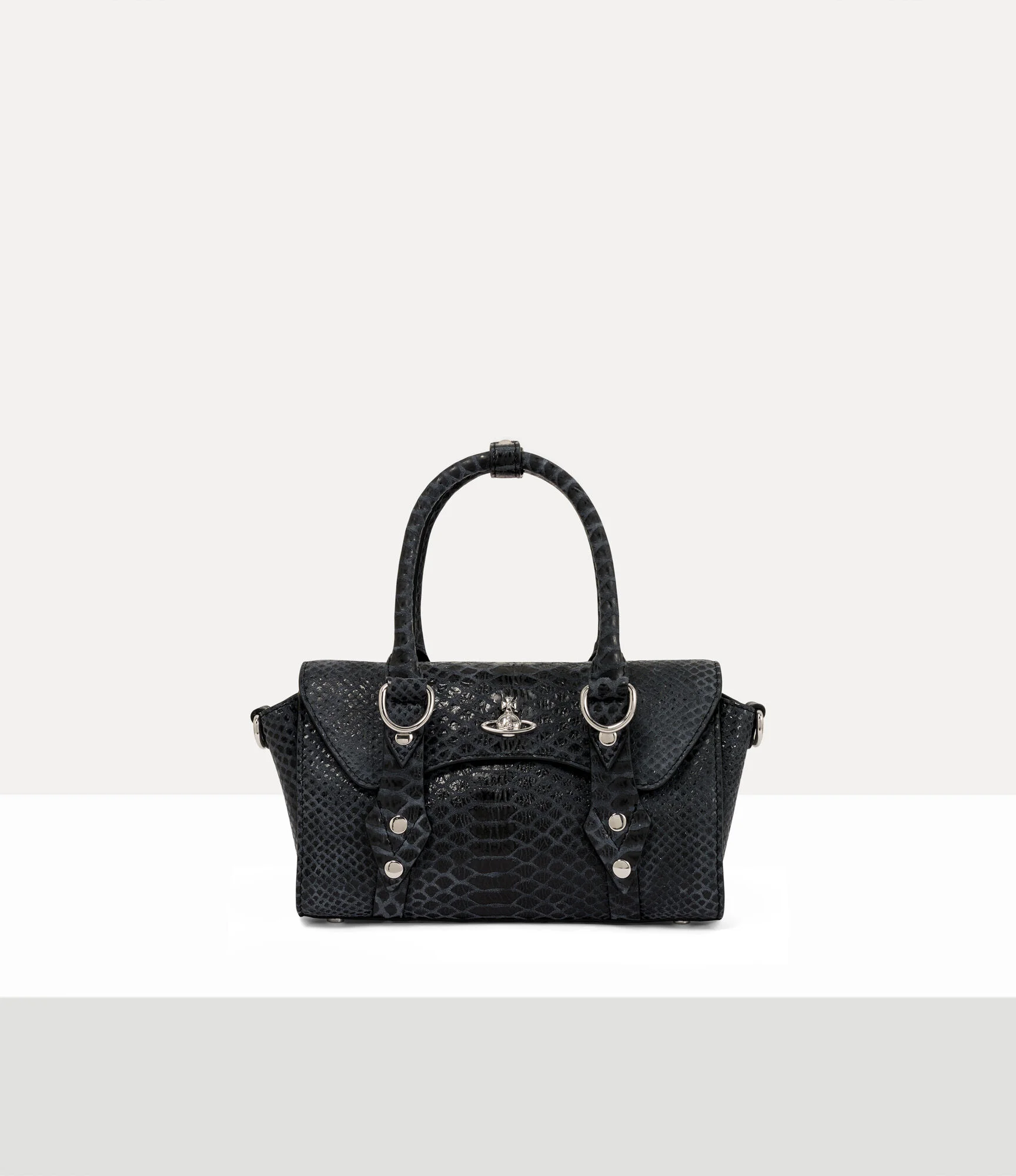 Our signature Bettina Mini crossbody bag is crafted in soft leather, complete with an intricate snake-effect embossed texture across the design. Inspired by the house’s ‘Betty’ range, the style is detailed with bondage-inspired hardware and a silver-tone D-ring for customisable charms. Code: 8053195450503 - Features a structural design - Polished bas relief orb motif - Flap closure - Compact shape - Zipped internal pocket - Magnetic closure - Removable strap - Length 22cm, height 15cm, depth 8cm - Made in Italy COMPOSITION - Main material: 100% cow leather - Interior lining: 65% cotton, 35% polyester - Hardware: silver-tone brass