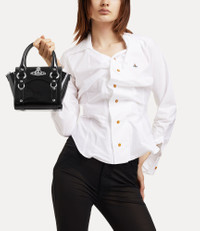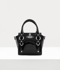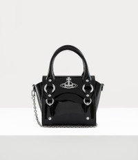 The Betty Mini handbag in black embodies our punk aesthetic, with silver-tone hoops and straps buckled across the exterior. Opening to reveal a functional interior, it is topped with a metal orb plaque. Code: 8050889297420 - Shiny patent finish - Hoop and stud detailing - Magnetic stud fastening - Internal zip-fastening pocket - Orb motif on the front panel - Top-handle silhouette - Extendable gussets - Recycled cotton interior lining - Unlined - Measurements: height 18cm, width 17cm, depth 9cm - Detachable chain strap measures 104cm - Made in Italy COMPOSITION - 100% Calf leather - The leather used has been awarded against the LWG Environmental Auditing standards designed to provide a measure of compliance and performance capabilities of the leather business.