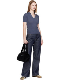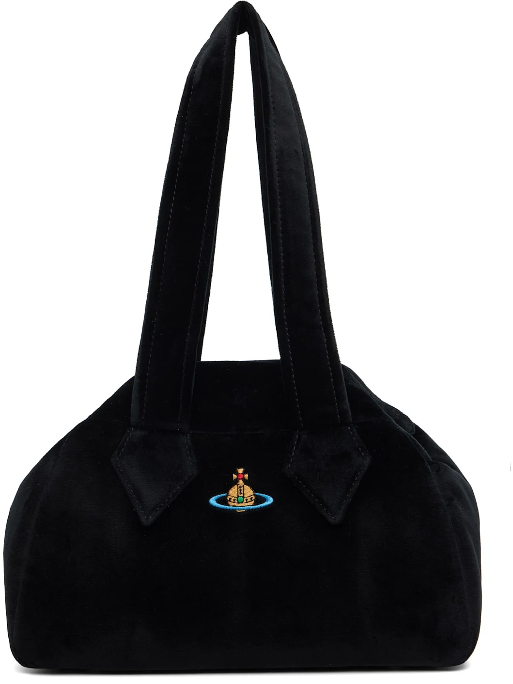 Velvet shoulder bag. · Twin shoulder straps · Embroidered logo at face · Bumper studs at base · Press-stud closure · Three patch pockets at interior · Patterned textile lining · H8.5" x W12" x D5" Supplier color: Black Cotton. Made in Italy 252314F046011