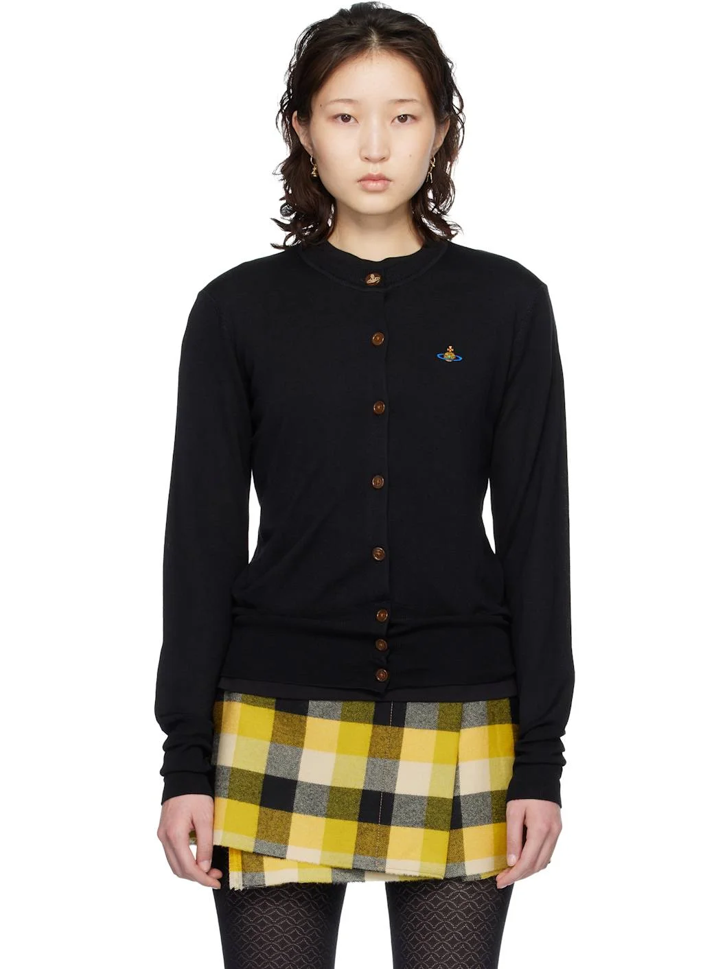 Knit wool- and silk-blend cardigan. · Rib-knit crewneck, hem, and cuffs · Button closure · Logo embroidered at chest Supplier color: Black 70% wool, 30% silk. Made in Italy 261314F095013