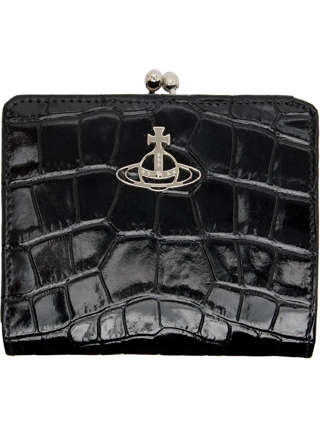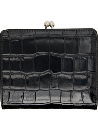 Croc-embossed patent calfskin bifold wallet. · Logo hardware at face · Press-stud closure · Eight card slots and three patch pockets at interior · One note slot · Kiss-lock coin compartment with two-compartment interior · Canvas lining · H3.75" x W4.5" x D1.5" Supplier color: Black Calfskin. Made in Italy 252314F040008