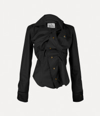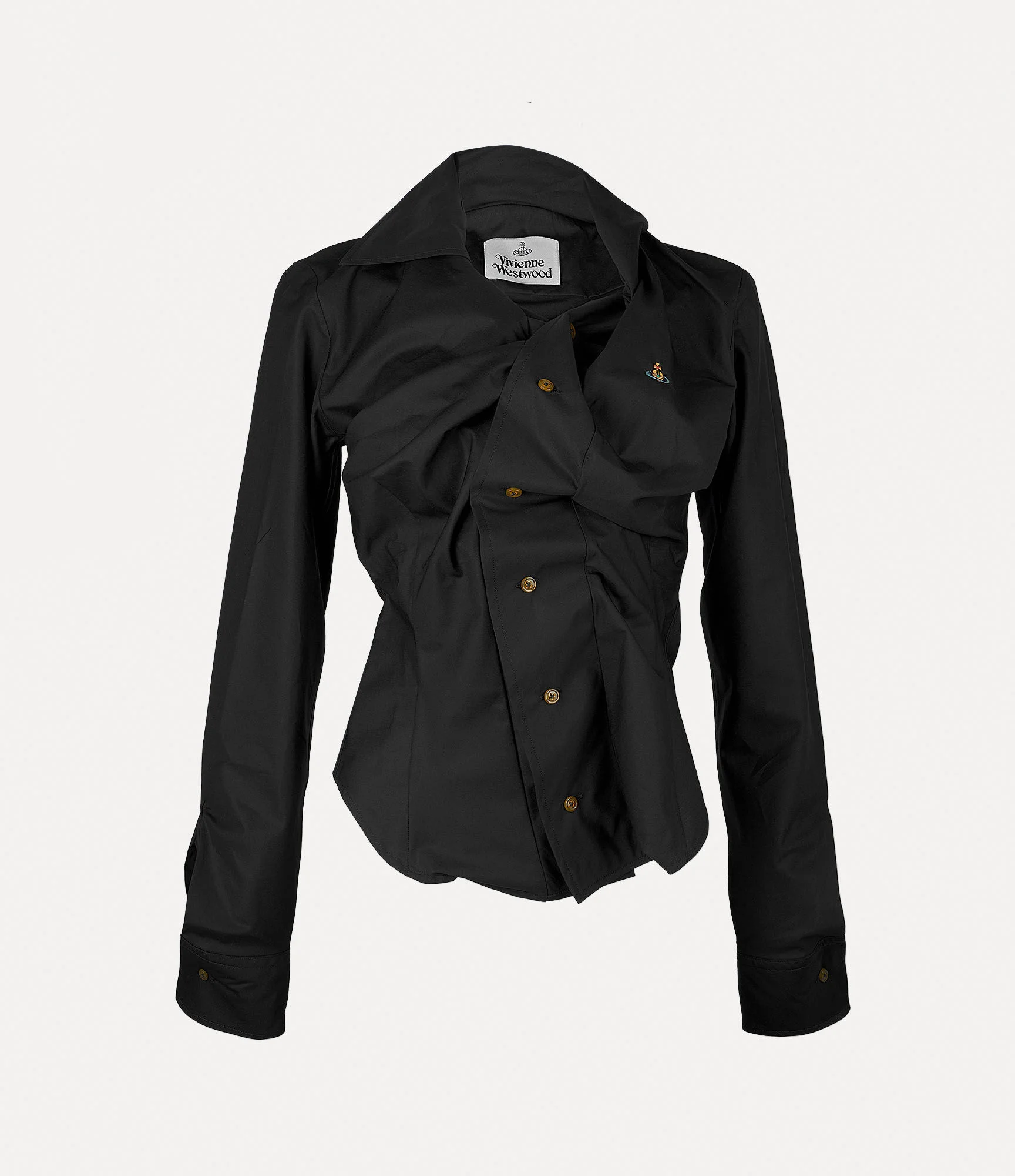 Made of organic certified cotton sourced from farms that take a regenerative approach, the Drunken shirt features elements of our 'alcoholic' tailoring system, such as an off-balance silhouette, drape detailing, and an asymmetric hemline. Code: 1501000C-W009Q-PI-BLACK - Front button fastening - Buttoned cuffs - Orb embroidery - Darting along the front - Long sleeves - Off-centre collar - Contorted seams - Cinched-in waist - The model is 5'11/180cm and is wearing a size 40. COMPOSITION - 100% Organic cotton