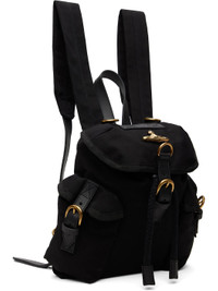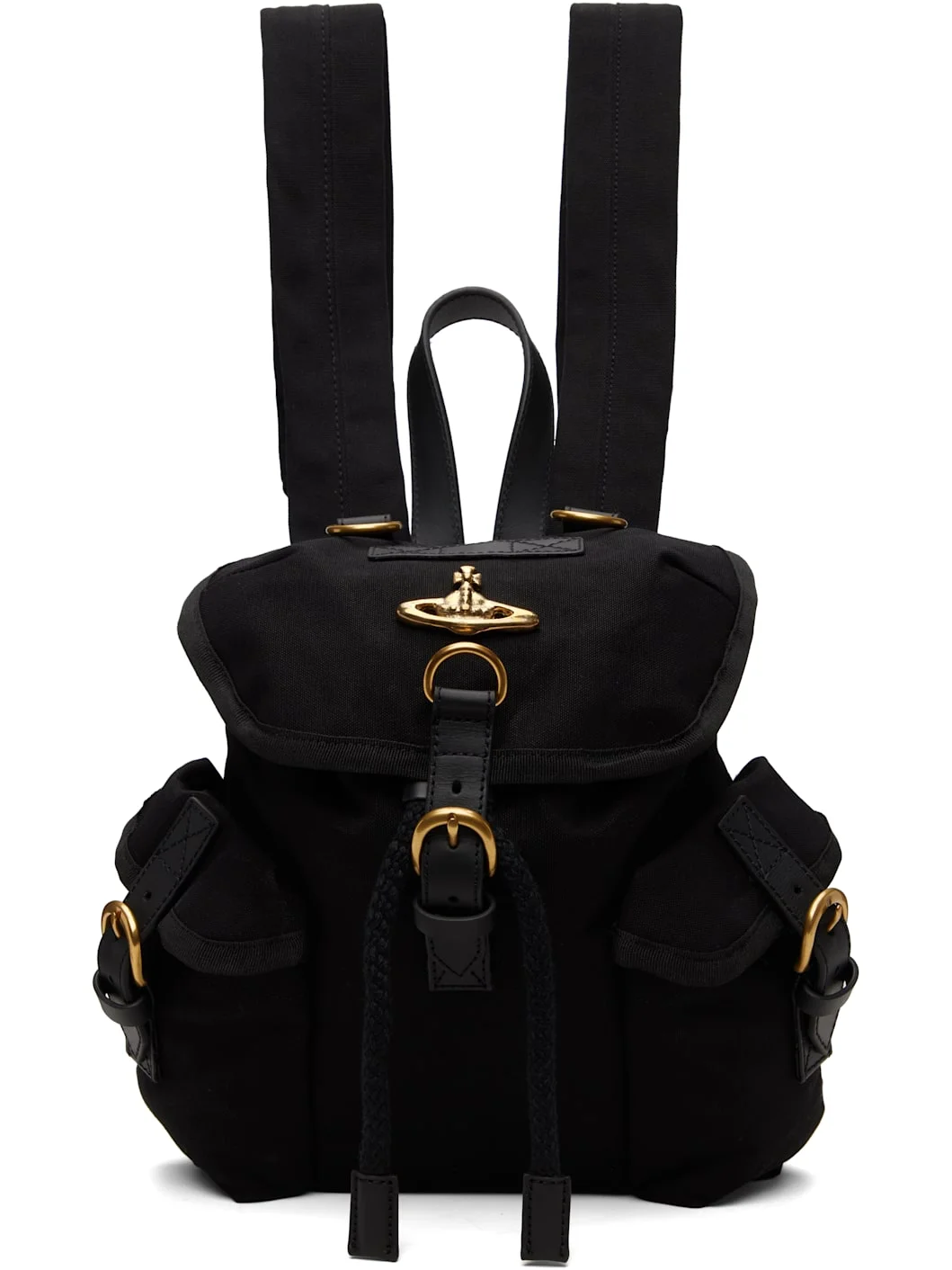 Handcrafted cotton canvas backpack. · Fixed carry handle · Adjustable shoulder straps · Loop and D-rings at top · Flap pockets at face · Logo hardware at pin-buckle foldover flap · Drawstring closure · Zip pocket at interior · Twill lining · H10.5" x W9.25" x D2.5" Part of the Made in Kenya collection. Supplier color: Black 100% cotton. Made in Kenya 261314F042002