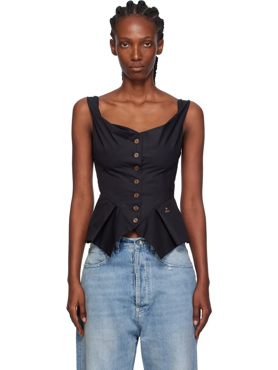 Regenerative cotton poplin top. · Cowl neck · Button closure · Darts at front · Welt pockets · Embroidered logo at front · Pleats at peplum hem Supplier color: Black 100% regenerative cotton. Made in Italy 252314F111008