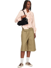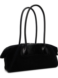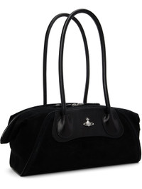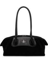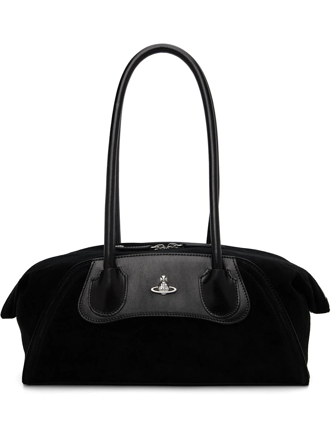 Calfskin suede shoulder bag. · Grained calfskin trim throughout · Twin rolled shoulder straps · Logo hardware at face · Press-stud tab at sides · Bumper studs at base · Two-way zip closure · Zip and patch pockets at interior · Twill lining · Logo-engraved silver-tone hardware · H6" x W12.5 " x D5" Supplier color: Black Calfskin. Made in Italy 252314F048065