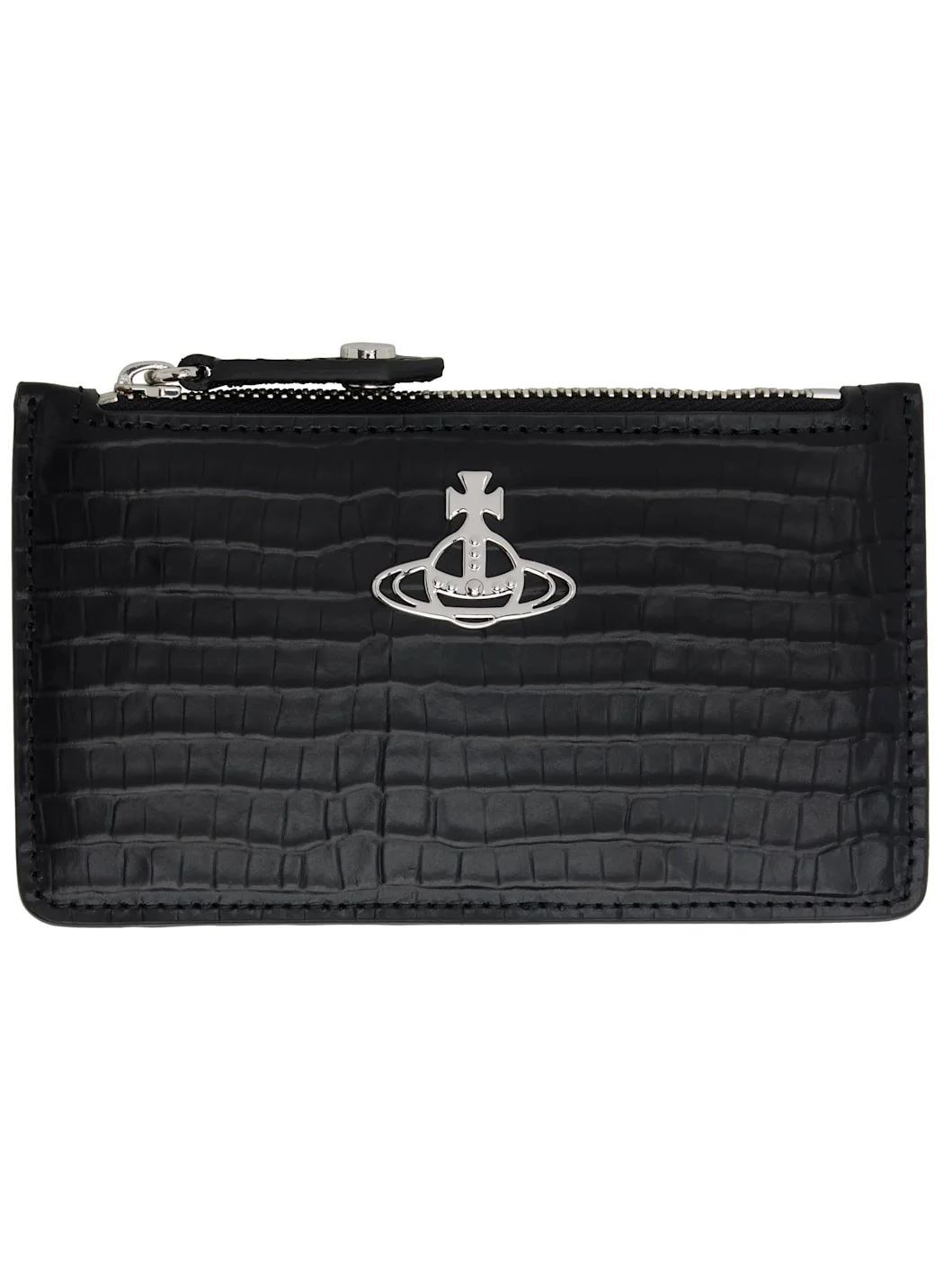 Croc-embossed polished leather card holder. · Logo hardware at face · Four card slots at back face · Zip coin compartment · Textile lining · H3" x W5.5" Supplier color: Black Leather. Made in Italy 252314F037009
