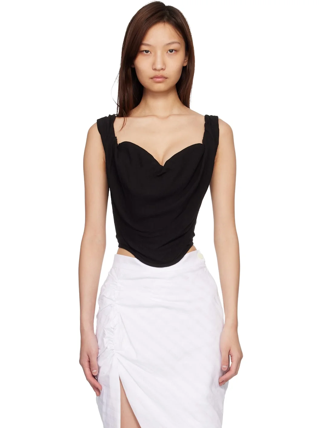 Hopsack corset-style top. · Boning throughout · Sweetheart neck · Draping at front · Curved hem · Elasticized shoulder straps · Zip closure at back Supplier color: Black Body 1: 100% viscose. Body 2: 16% polyamide, 16% polyamide. Lining: 71% cupro, 29% cotton. Made in Italy 261314F111030